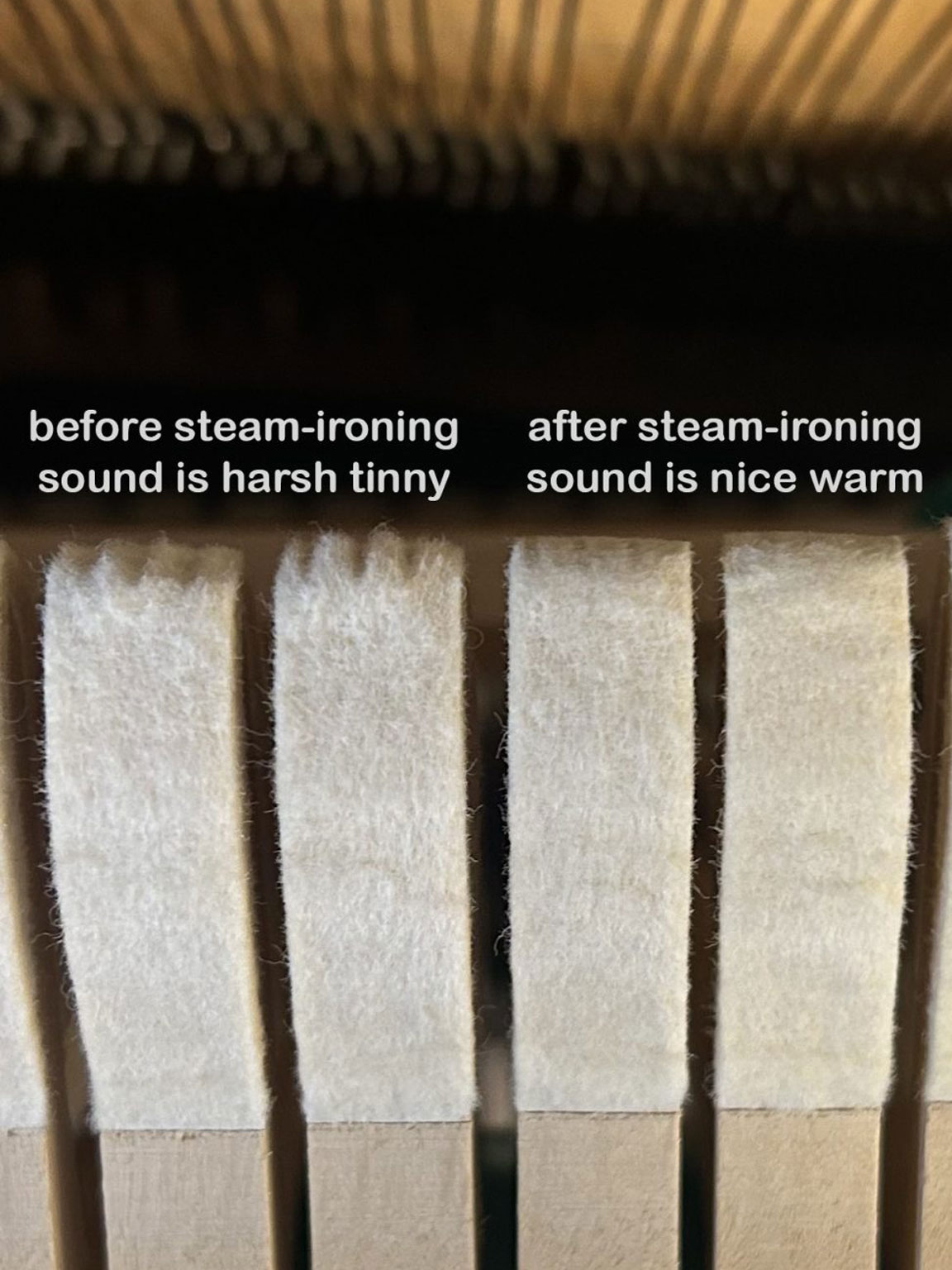 By loosening up the felt with needles or reshaping the hammers with sandpaper or using steam-ironing (who still does that? Well I do), the tone of your piano can be significantly improved.